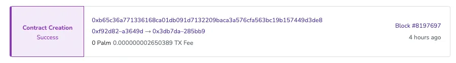 Summary=======> Total deployments: 1> Final cost: 0.000000002650389 ETH10. Look Up Your Deployment on the Palm Network Block Explorer