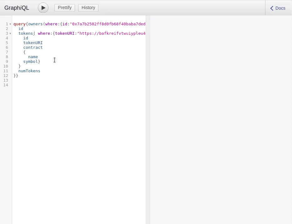 To query data on your newly deployed ERC-721 contract use GraphiQL