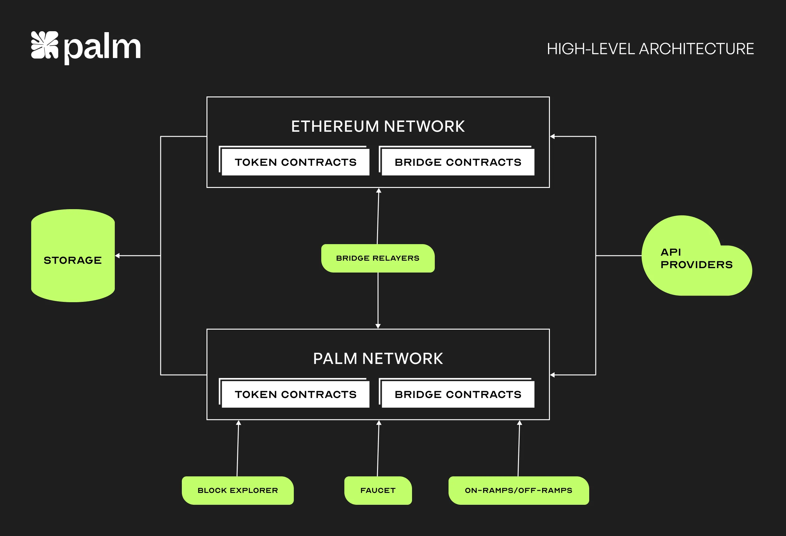An automated bridge relay service connects payment tokens, like DAI, and NFTs on Ethereum and the Palm network, with bridging contracts deployed on both networks to manage the connection. Fees collected from this bridge cover gas costs on Ethereum and are partially used to purchase carbon offsets.